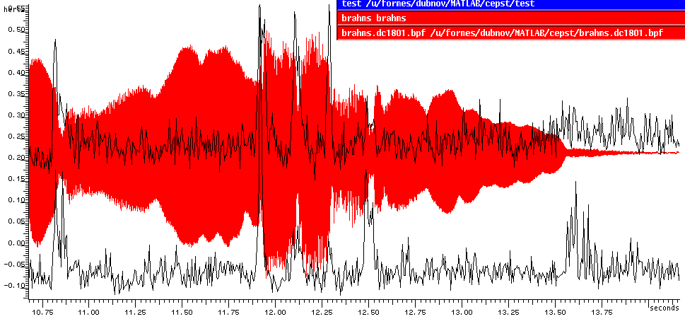 For short time description of the sound we use a of spectral envelopes , very much like in speech, which allow for up to 90% of data reduction in sound representat ion. Moreover, a vector quantisation (VQ) procedure further reduces the set of envelopes by optimally representing the complete dataset with just a few typical ones. In order to capture the transitional spectral characteristics, we use cepstral derivative as an additional feature. A first order difference between neighbouring cepstra is used as an esti mate for the derivative at a given time instant. In order to capture the information present in higher cepstral coefficients as well, additional parameters are under consideration. One must note that the higher cepstral coefficients correspond to the excitation signal (also called the residual). Variations in the fundamental frequency are important for characteris ation of the transitional spectra and should be considered in correlation to the cepstral derivative. HOS parameters describe the residual properties i n terms of non-linear properties of the sound and are related to phase couplin g in harmonic signals and texture properties in noise signals. Cepstral est imation of HOS will be in the domain of our future research. Once the raw sound signal is converted into symbolic representation by VQ procedure, we apply the notion of entropy to compare sequences in terms of similarity between their statistical sources.
