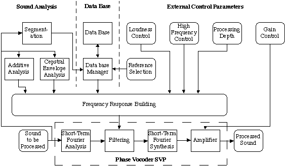 The basic idea of our voice morphing technique consists in modifying the spectral envelope of the soprano voice to match that of the counter-tenor voice. This is achieved by a frequency domain filtering through a phase-vocoder [Depalle et al., 91] (Cf. figure 1). But we use a more refined technique which is described now.