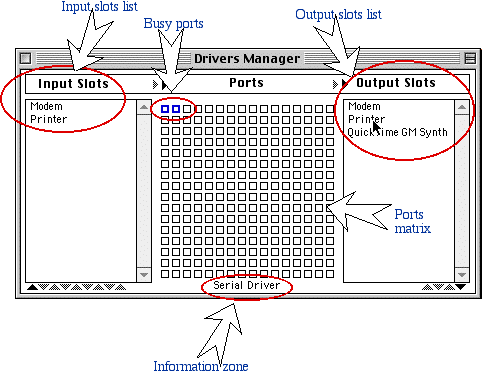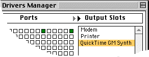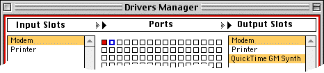 Each driver is declaring input and output slots, corresponding to the supported input and output ports. For example, the Serial Driver declare 2 slots named 'Modem' and 'Printer', corresponding to the Macintosh modem and printer serial ports. The Quicktime driver declare a single output slot named 'Quicktime GM Synth'.