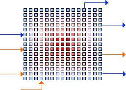 The user interface is similar to msConnect : on the left are the input slots, on the right the output slots and on the middle, a 16 X 16 matrix which represents the 256 MidiShare ports. Ports outlined in blue color are busy ports (ie ports which are connected to at least one slot), the others are free ports (ie ports which are not connected to any slot).