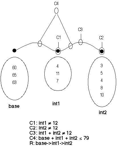 A partial order can be defined on PIMS's as follows: Let P=<D1, R, C> and Q=<D2, R, C> be PIMS. If any cartesian product on D1 is contained in some cartesian product on D2 then P<=Q. Given a PIMS P, the PIMS instanciation problem consists in finding a PIMS exemplary E such that E<=P. In this case E is said to be an exemplary of P. Seen from this perspective a PIMS is a structure scheme representing the set of its exemplary structures. The graph in the figure below represents a PIMS for the set of all three note chords beginning in any one of the notes in the set base (in MIDI), having consecutive intervals taken from the sets int1, int2 (in semitones), not containing octaves and positioned within the register from 60 to 79 in MIDI.