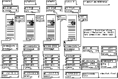 More informations about this patch can be found in a paper written by Gérard Assayag (Assayag 1993). A simulation of the passage has been played on a Yamaha SY77 synthesizer connected to PatchWork running on a Macintosh.