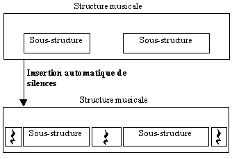 L'insertion automatique de silences consiste donc à parcourir intégralement la structure et, à chaque niveau de profondeur, à insérer des silences là où l'on trouve des " blancs ". On observe donc, à partir de chaque élément non terminal de la structure hiérarchique, comment se réparti son contenu. Lorsque des " blancs " sont repérés, c'est à dire que des sous-structures consécutives ne sont pas juxtaposées, un objet de type " silence " est crée et inséré en ajustant sa durée de manière à remplir l'espace vide.