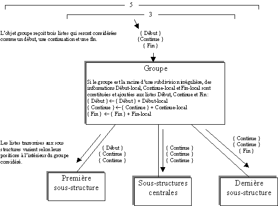 Observons le fonctionnement local de cette opération : un objet groupe reçoit un ensemble de trois listes : début, continue et fin correspondant aux informations à transmettre aux objets terminaux qu'il contient, correspondant à d'éventuelles subdivisions irrégulières dans lesquelles il serait imbriqué.