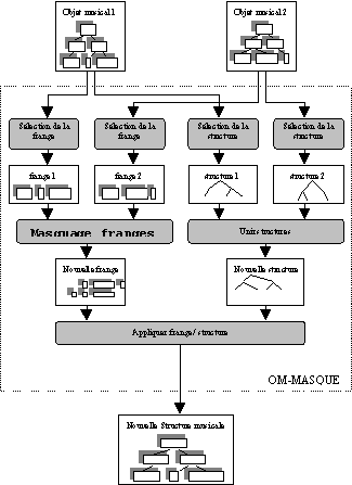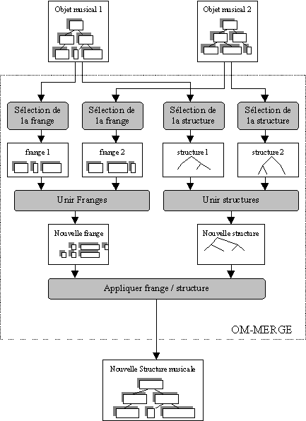 Le schéma opérationnel de la fusion reste relativement simple et intuitif : de chacun des deux objets musicaux originaux, on extrait d'une part une frange, c'est à dire une liste des objets terminaux de la structure hiérarchique repérés de manière absolue dans le temps, et d'autre part une structure, c'est à dire l'objet original privé de ses éléments terminaux.