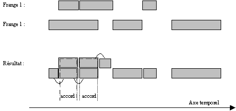 Cette opération est plus que l'union des deux listes, triée suivant l'ordre croissant des positions temporelles. Les notes figurant dans les deux objets originaux apparaîtront dans l'objet résultat, soit sous forme de note lorsqu'elles sont isolées, soit sous forme d'accord lorsqu'elles apparaissent de manière simultanée avec d'autres notes. Ainsi il est nécessaire, pour pouvoir constituer des accords, que les notes simultanées aient la même durée et donc d'effectuer éventuellement une fragmentation de certaines notes pour les ajuster à des durées plus courtes. Sans rentrer vraiment dans le détail de la programmation, le schéma suivant illustre la tâche de cette opération :