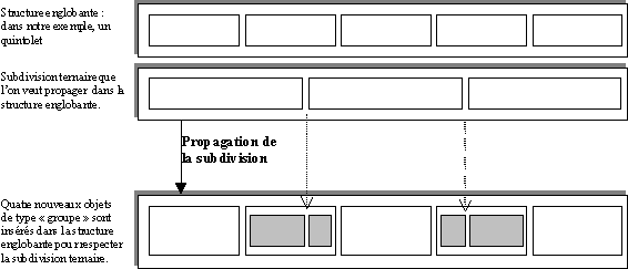 Une fois la subdivision irrégulière détectée, il s'agit de propager, de manière récursive, de la racine jusqu'aux éléments terminaux, les informations nécessaires à la mise en forme. Cette opération s'avère relativement délicate du fait que plusieurs subdivisions irrégulières peuvent être imbriquées.