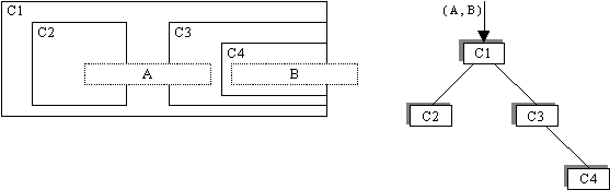 Illustrons cet algorithme par un exemple : on suppose que l'on veut appliquer deux éléments terminaux A et B à une structure de containers C1, C2, C3 C4 comme suit :