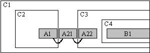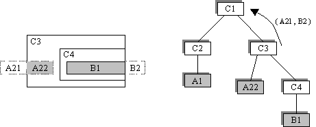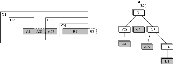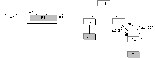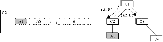 C2 est un élément terminal de la structure. Le container ramasse donc la partie des éléments terminaux qui lui revient : A est fragmenté en A1 et A2, et B n'est pas touché. C2 garde donc A1 et rejette (A2, B) :