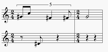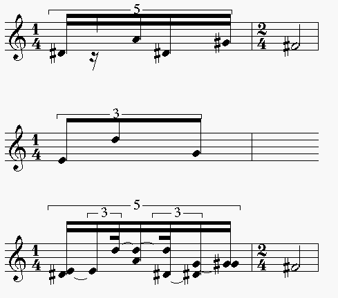 Un premier exemple de fusion mettant en regard un quintolet et un triolet permet d'avoir une idée sur le type de résultats auxquels on peut s'attendre. Les deux premières portées sont les voix originales. La troisième correspond à la fusion des deux autres :