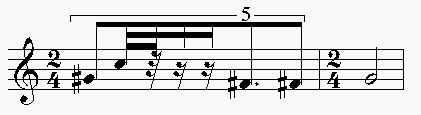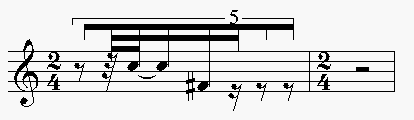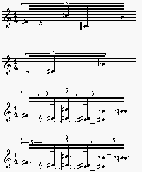 L'exemple suivant illustre ce problème : les deux premières voix représentent les objets à fusionner, un quintolet de doubles croches mis en regard avec un triolet de croches. La troisième portée est la fusion résultante dans le cas où le quintolet est englobant : la subdivision par trois est propagée à l'intérieur du quintolet et le résultat est un quintolet de doubles croches dont les éléments sont éventuellement divisés en trois. La quatrième portée représente le cas contraire, le triolet est englobant et le résultat est un triolet dont chaque élément est forcément - subdivisé en cinq.