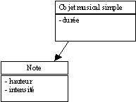 Ce lien d'héritage entre les deux classes rend le champ " durée " accessible depuis n'importe quelle instance de la classe note. La définition d'une note se fait donc finalement comme si celle-ci possédait trois paramètres : hauteur, intensité et durée.