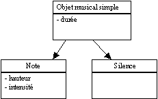 Ainsi, les liens d'héritage permettent de structurer les champs de la manière la plus générale possible, en les rendant accessibles à toutes les sous-classes qui ont cette particularité en commun : on peut définir, par exemple, depuis la classe Objet musical simple, la classe " silence ", qui par héritage bénéficie du champ durée de sa super-classe. Par contre, elle ne possède aucun champ qui lui est spécifique mais elle autorise, simplement en observant le type d'instance, la distinction entre un objet note et un objet silence.