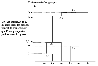 On observe, dans cette classification hiérarchique ascendante de six individus, que les deux dernières agglomérations de groupes se trouvent relativement haut sur l'axe vertical : simplement, ces deux derniers regroupements correspondent à ceux de groupes relativement distants. Ainsi, l'inertie intra-groupe augmente fortement : ces deux derniers regroupements n'étaient pas intéressants.