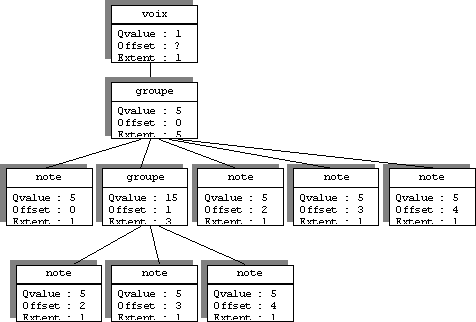 L'objet groupe, immédiatement situé dans le contenu de l'objet voix, nécessite, lui, une qvalue de 5, non pas pour exprimer sa durée, puisque son extent de 5 signifie qu'il dure lui aussi une noire, mais pour exprimer la position des différents éléments qu'il contient.