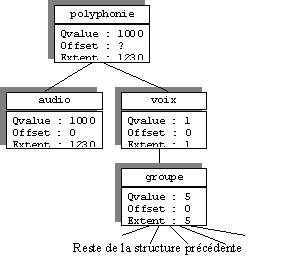 Le lien entre ce temps hiérarchique et un temps plat en millisecondes se fait par l'intermédiaire du tempo, fixé arbitrairement à 60 à la noire. Par exemple, supposons que l'on souhaite mettre en commun notre structure avec un fichier audio dont la durée est 1230 millisecondes, dans un objet polyphonie. La qvalue de la racine de la structure devient 1000 (à un tempo de 60 à la noire, un millième de noire correspond à une milliseconde). Cette valeur est toujours compatible avec la structure précédente, et l'on pourra noter que l'objet voix possède maintenant une valeur offset. Celle-ci (elle vaut 0) est exprimée dans la subdivision de la noire définie dans l'objet polyphonie, le niveau hiérarchique immédiatement supérieur.