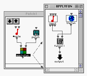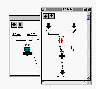 On y retrouve donc la notion de patch, un cadre représentant graphiquement l'organisation des différentes fonctionnalités définissant une opération. Un patch peut à son tour être plongé dans un autre patch : il prend alors deux interprétations possibles, soit sous forme d'opérateur, devenant alors une des fonctionnalités qui définissent une opération d'ordre supérieur, soit sous forme de donnée, devenant un argument fonctionnel à un autre patch, et rendant paramétrable la nature même d'un calcul. Cependant, cette notion a été élargie à un type de patch particulier : les maquettes. Elles sont l'expression d'un patch ordinaire, dans lequel la position en abscisse des objets prend une valeur temporelle. Ces maquettes offrent un intérêt tout particulier aux applications dans le domaine musical.
