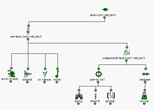 Les liens figurant entre les classes sur ce schéma symbolisent les relations d'héritage. Par exemple, un accord (chord) est un objet parallèle (parallel), qui lui-même est un objet musical composé (compound-musical-object). Cela signifie que la classe chord hérite de la classe parallel et donc de la classe compound-musical-object. Ainsi, toute instance de la classe accord aura, en plus d'éventuelles spécifications propres aux accords, toutes les caractéristiques d'un objet-musical-composé. De même, toute méthode décrite sur la classe compound-musical-object pourra s'appliquer à une instance de la classe chord.