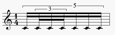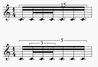 Il s'agit en effet soit d'un " quinzolet " , c'est à dire quinze doubles croches dans le temps de huit, soit d'un triolet de triples croches imbriqué dans un quintolet de doubles croches. Si la deuxième forme semble la plus probable, puisque les musiciens sont plus habitués à effectuer des découpages du temps en des valeurs relativement petites, la première reste néanmoins tout à fait acceptable et peu fort bien être justifiée. Seule une structure en arbre, par exemple de la forme (1 (1 (1 (1 1 1)) 1 1 1 )) (en interprétant l'expression (1 (1 1 1)) par une unité subdivisée en trois, la structure récursive précédente indique un temps qui se subdivise en 5 unités égales, et dont la deuxième se subdivise en trois) spécifie convenablement et entièrement l'imbrication de subdivisions irrégulières.
