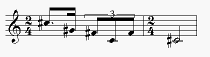 (WCMN (AUTOMATIC-BEAT-SUBDIVISION-NUMBERS NIL) (AUTOMATIC-NATURALS T) SYSTEM (STAFF TREBLE (METER 2 4 (BEAMING (LIST 1.0 1.0))) (CS5 (RQ 3/4)) (GS4 (RQ 1/4)) (FS4 (RQ 1/3) (SETF TUP1 (BEAT-SUBDIVISION- (SUBDIVISION 3)))) (C4 (RQ 1/3) (-BEAT-SUBDIVISION- TUP1)) (F4 (RQ 1/3) (-BEAT-SUBDIVISION TUP1)) BAR (METER 2 4 (BEAMING (LIST 2.0))) (CS4 (RQ 2)) BAR))