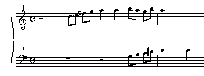 Le premier exemple est trop simple pour etre vrai mais c'est un bon "benchmark", un bon exemple de test. Il s'agit d'un enregistrement d'une piece pour piano jouee par un piano numerique. La partition originale est donnee dans la figure 8. Le son a ete echantillonne a 44100 kHz, comme tous les autres exemples. L'analyse FFT est faite sur 2048 points avec un pas d'avancement de 256 points, egalement comme les autres exemples. La figure 9 montre le sonagramme .