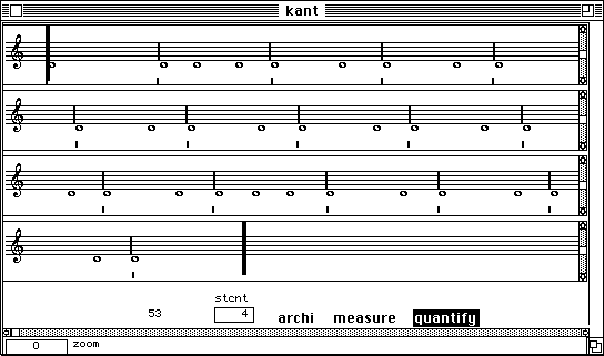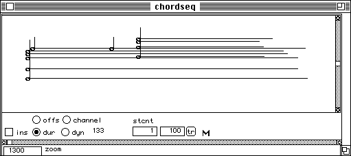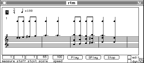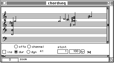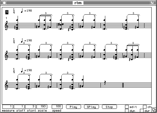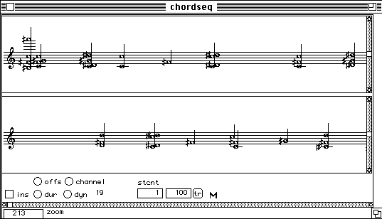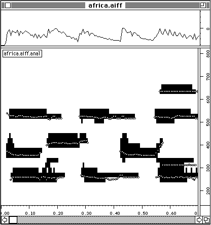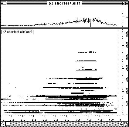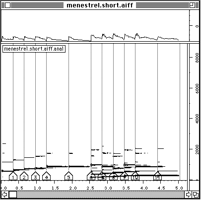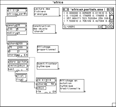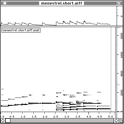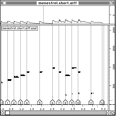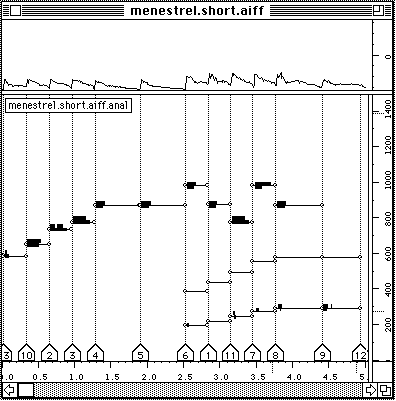 Nous voulons dire un petit mot sur le temps de calcul. Pour l'extraction de la description suite d'accords, trois analyses FFT sont necessaires: (1) pour le calcul du sonagramme, (2) pour la detection des debuts, (3) pour la description des unites en accords. Neanmoins, le temps total de calcul reste faible. Faisons un test. Nous refaisons l'analyse du Chant de Menestrel (voir ci-dessous). Il est maintenant 19 h 09 exact. L'analyse est finie, les accords sont notes dans un fichier et il n'est pas encore 19 h 12. L'affichage en notation musicale proportionnelle dans PatchWork est a partir de la instantanee. Cela veut dire moins de trois minutes pour un son de cinq secondes. L'analyse etait faite avec une FFT sur 2048 points avec un pas d'avancement de 256 points et sur une machine PowerPC 7100/66. Sur les versions plus performantes (i.e. PowerPC 8100 / 110 voire meme le nouveau PowerPC 9100!) cette analyse se fait deux a trois fois plus vite. Le temps de calcul n'est pas vraiment un obstacle.