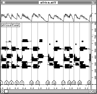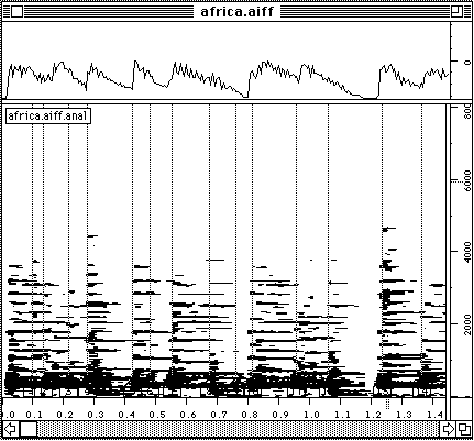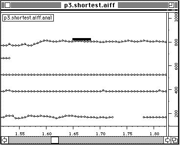 Finalement ces donnees sont introduites dans AudioSculpt (figure 17). On retrouve assez bien ce qui pourrait etre la partition de l'enregistrement. Si on veut ecouter les resultats sur le synthetiseur MIDI il est important de les ecouter avec une precision d'un quart de ton ou meme plus precis car il s'agit d'une musique non temperee. Les legers arrondissement de frequences changent le caractere du resultat sensiblement.