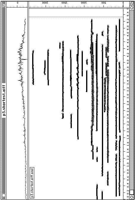 Sur ce son nous lancons le suivi de partiels. Le contraste a ete regle pour ne pas garder tous les partiels du son et pour couper le bruit au debut. Nous ne pouvons pas mettre le seuil trop haut, sinon on coupe trop de partiels aigus. Dans figure 24 est affiche le resultats de cette analyse. On voit que le nombre de points qui sont finalement affiches est grand. Dans cette exemple l'affichage reste controlable. Certains partiels ont ete lies ensemble, d'autres ont ete separes en deux.