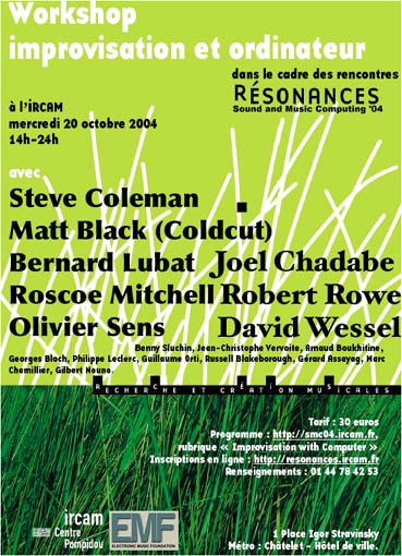 This workshop is dedicated to the interaction between man and machine inside an improvisational context. Beyond simple sound effects and the immediate processing of sound signals produced by the musician, now rather uninspiring, these presentations aim to focus on a modeling of musical structure and an interaction of the musician with this model. As such, can the computer expand the musical field and by entering into an exchange with the musician, create surprises within a controlled framework? Each hour-long session will address a musical/technological problem using sound illustrations followed by the live performance of an artist specialized in improvisation, putting into practice the systems presented. It is important to point out that the main topic of the workshop is not the technical complexity of the computer systems presented, but the fitting of these computer environments, whatever they be simple or complex, to the musical improvisation project associated with them.